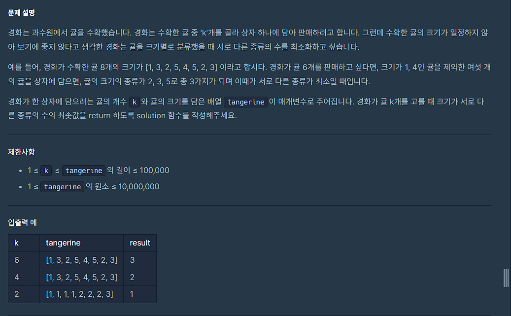 public int solution(int k, int[] tangerine) {