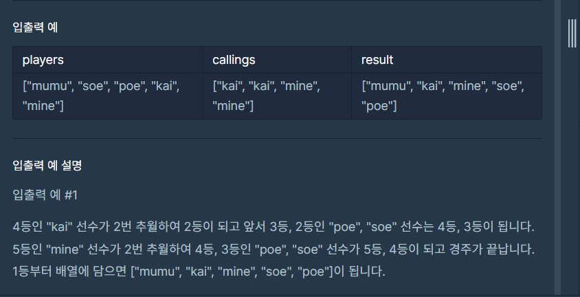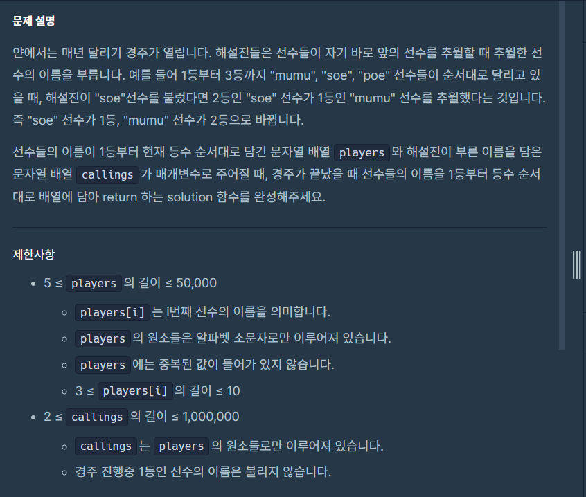 * @param players 선수들의 이름이 1등부터 현재 등수 순서대로 담긴 문자열 배열