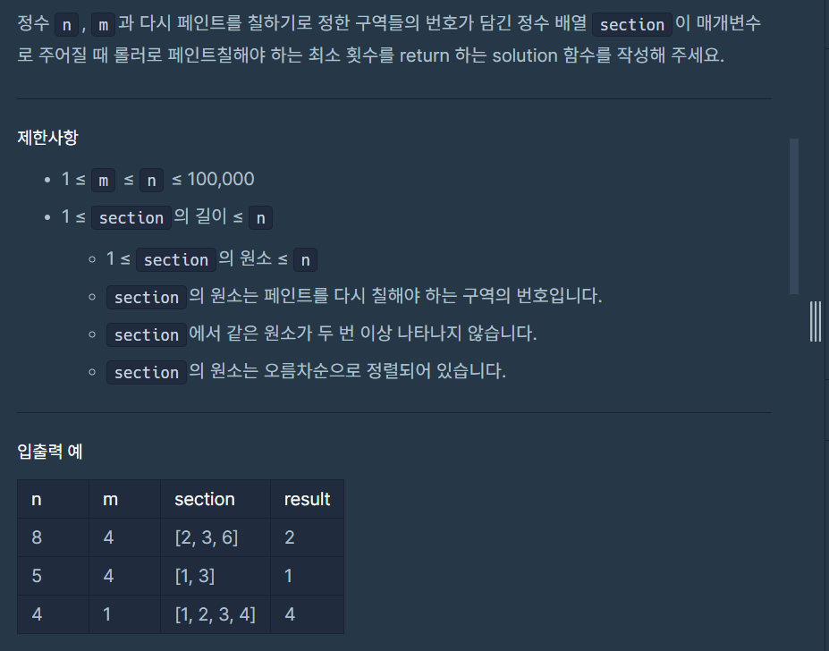 public int solution(int n, int m, int[] section) {