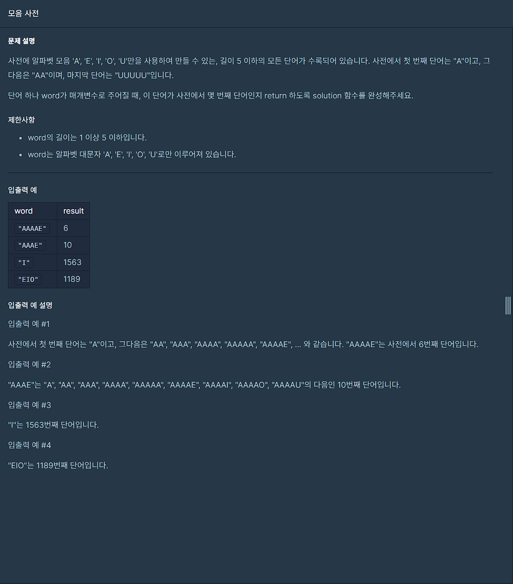 * 완전탐색을 사용해 모든 모음의 경우의 수를 찾아 HashSet에 저장한다.