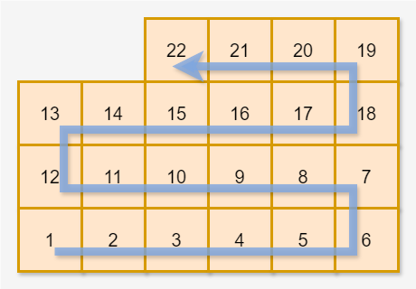 왼쪽에서 오른쪽으로 가면서 1번 상자부터 번호 순서대로 택배 상자를 한 개씩 놓습니다. 가로로 택배 상자를 w개 놓았다면 이번에는 오른쪽에서 왼쪽으로 가면서 그 위층에 택배 상자를 한 개씩 놓습니다. 그 층에 상자를 w개 놓아 가장 왼쪽으로 돌아왔다면 또다시 왼쪽에서 오른쪽으로 가면서 그 위층에 상자를 놓습니다. 이러한 방식으로 n개의 택배 상자를 모두 놓을 때까지 한 층에 w개씩 상자를 쌓습니다.