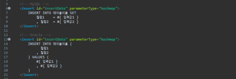-> INSERT INTO 테이블이름 SET 컬럼1 = #{ 입력값1 }, 컬럼2 = #{ 입력값2 }, ...