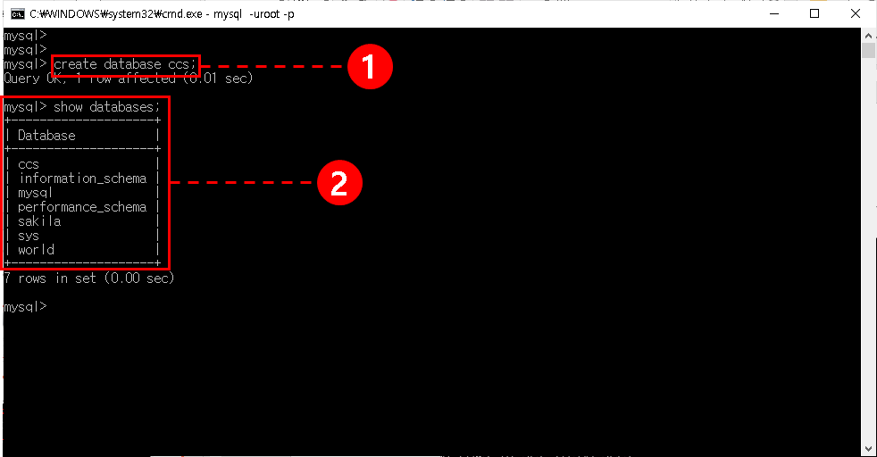 저는 create database ccs; 를 입력했습니다.