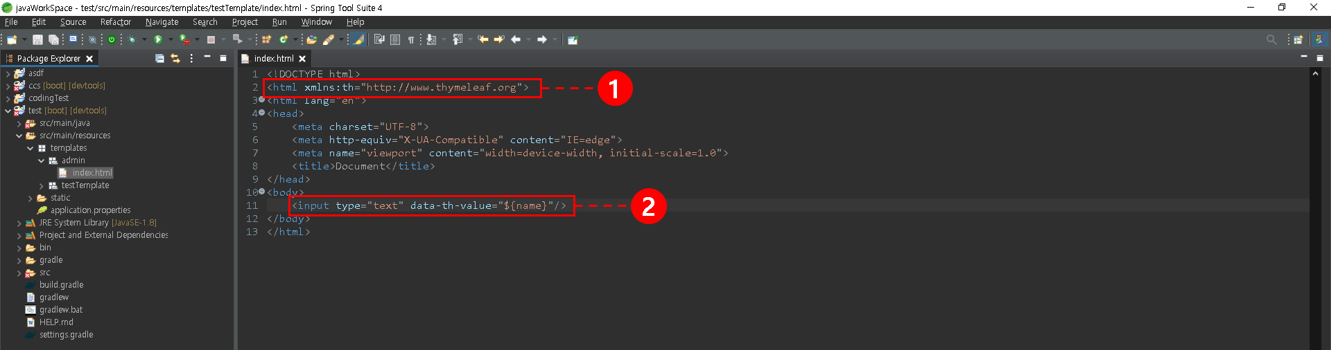 ④ 아래의 코드를 2번째 줄에 입력하면 이 HTML은 Thymeleaf라는 템플릿엔진을 이용해서 동적페이지로 변경되었다.