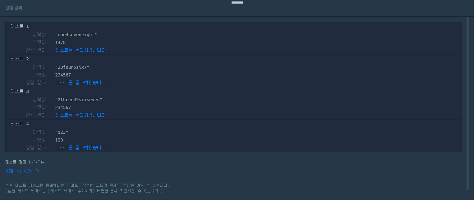 | 네오와 프로도가 숫자놀이를 하고 있습니다. 네오가 프로도에게 숫자를 건넬 때 일부 자릿수를 영단어로 바꾼 카드를 건네주면 프로도는 원래 숫자를 찾는 게임입니다. 다음은 숫자의 일부 자릿수를 영단어로 바꾸는 예시입니다. 1478 → "one4seveneight" 234567 → "23four5six7" 10203 → "1zerotwozero3" 이렇게 숫자의 일부 자릿수가 영단어로 바뀌어졌거나, 혹은 바뀌지 않고 그대로인 문자열 s가 매개변수로 주어집니다. s가 의미하는 원래 숫자를 return 하도록 solution 함수를 완성해주세요. |